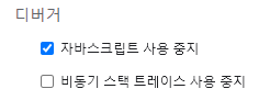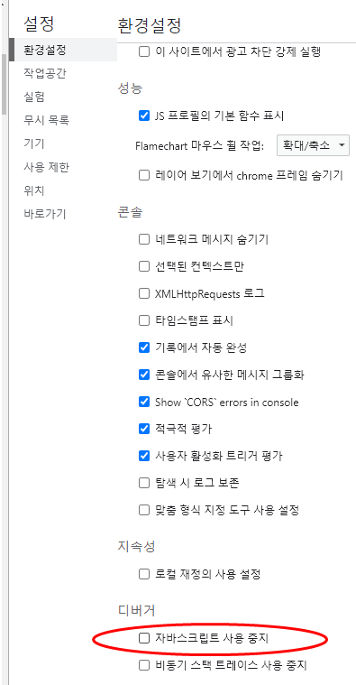 아래쪽의 "자바스크립트 사용 중지"의 체크박스에 체크를 넣어준다.