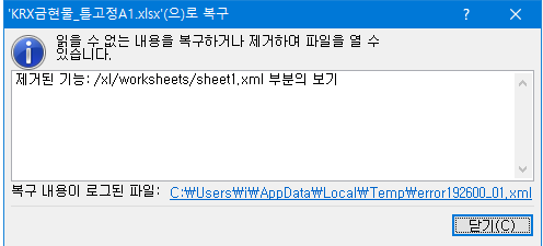 하지만, 프로그램상 엑셀화면이 열리지 않았기 때문인지, 아래와 같은 꺼림직한 메세지가 나온다..