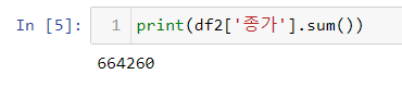 이렇게 얻은 df2의 '종가'열의 합을 구해보자.