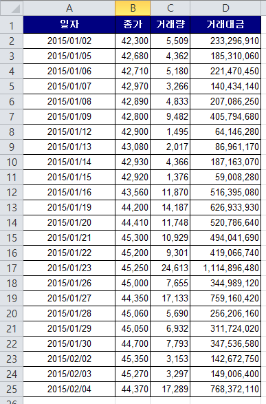아래와 같은 데이터가 있다면(KRX금현물3.xlsx)