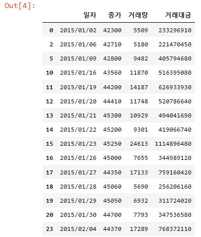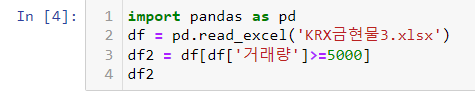 3행 : df 중에서 '거래량'>=5000을 만족하는 행을 df2로 넣는다