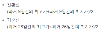 전환선 (과거 9일간의 최고가+과거 9일간의 최저가)/2기준선(과거 26일간의 최고가+과거 26일간의 최저가)/2후행스팬금일 종가를 26일 전에 기입선행스팬1(금일 전환선값+금일 기준선값)/2, 이 수치