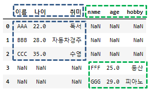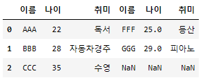 concat()식에 axis=1 을 넣어 준다. 행의 갯수가 부족한 곳에는 NaN으로 채워 진다.