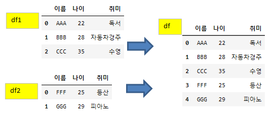 아래와 같은 df1과 df2에 대해서 concat()을 수행하면 어떻게 될까?